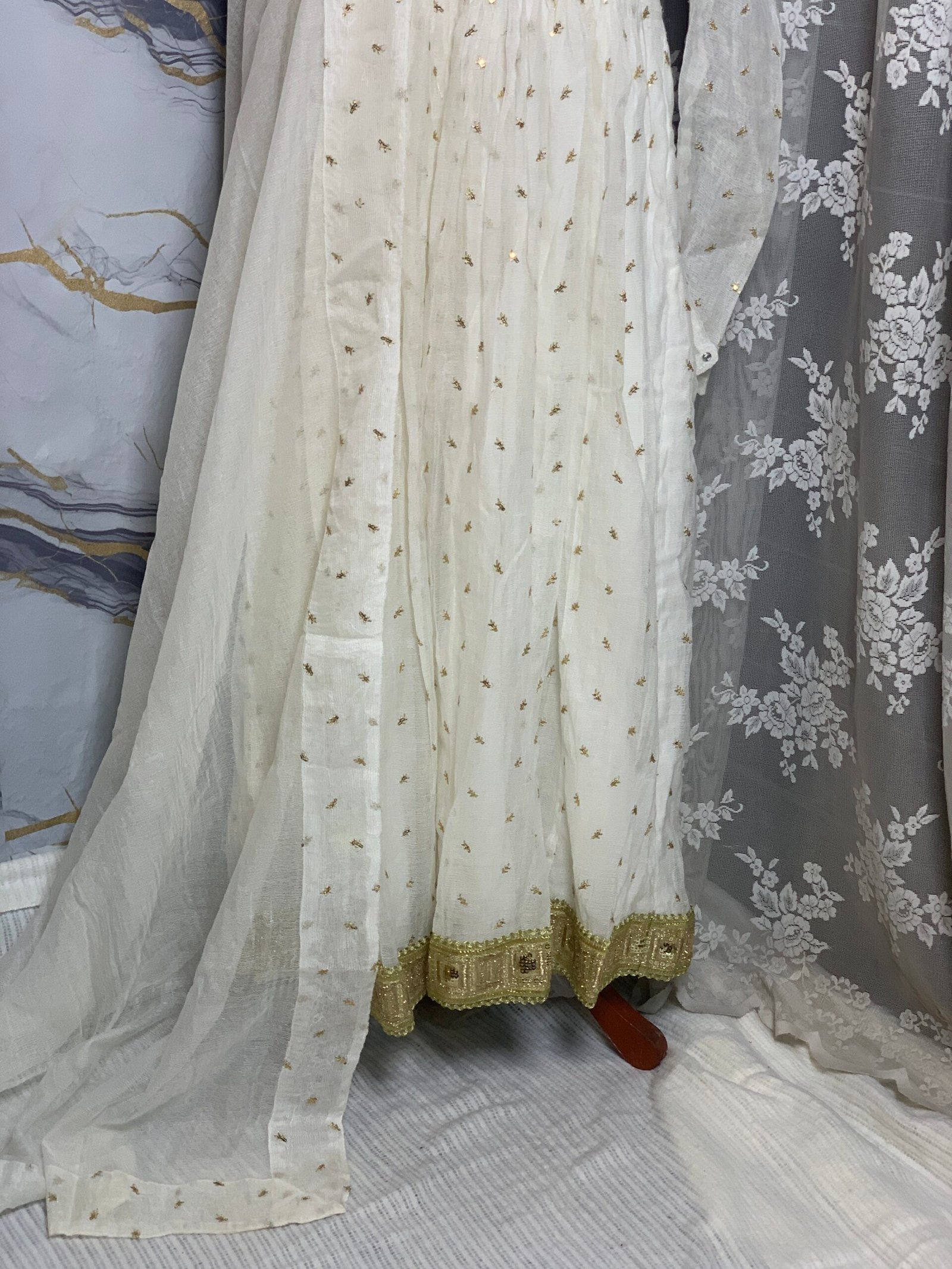 Designed for the simplicity of a Nikah ceremony and the elegance of bridesmaids, this beautiful Pure Khadi Net Frock offers a graceful and sophisticated look. The soft ivory shade combined with golden detailing creates a delicate and angelic appearance that is perfect for special occasions.