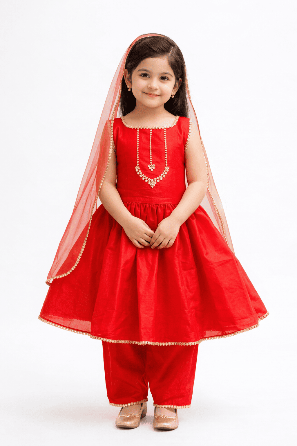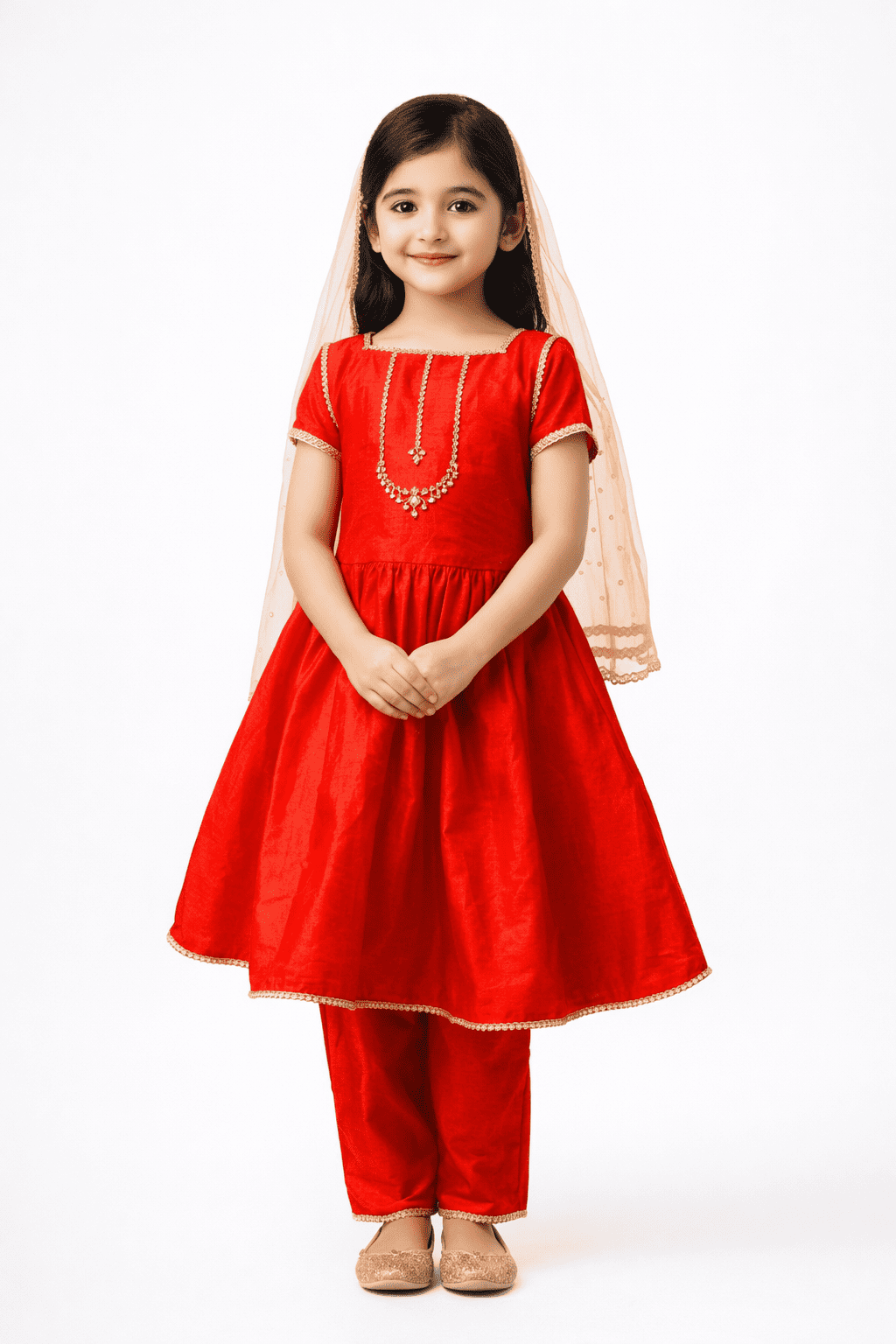 This vibrant red outfit combines traditional charm with a modern style. It is made from premium lawn fabric that keeps your little one cool and comfortable. The outfit is perfect for Eid, Mehndi events, and festive family gatherings.