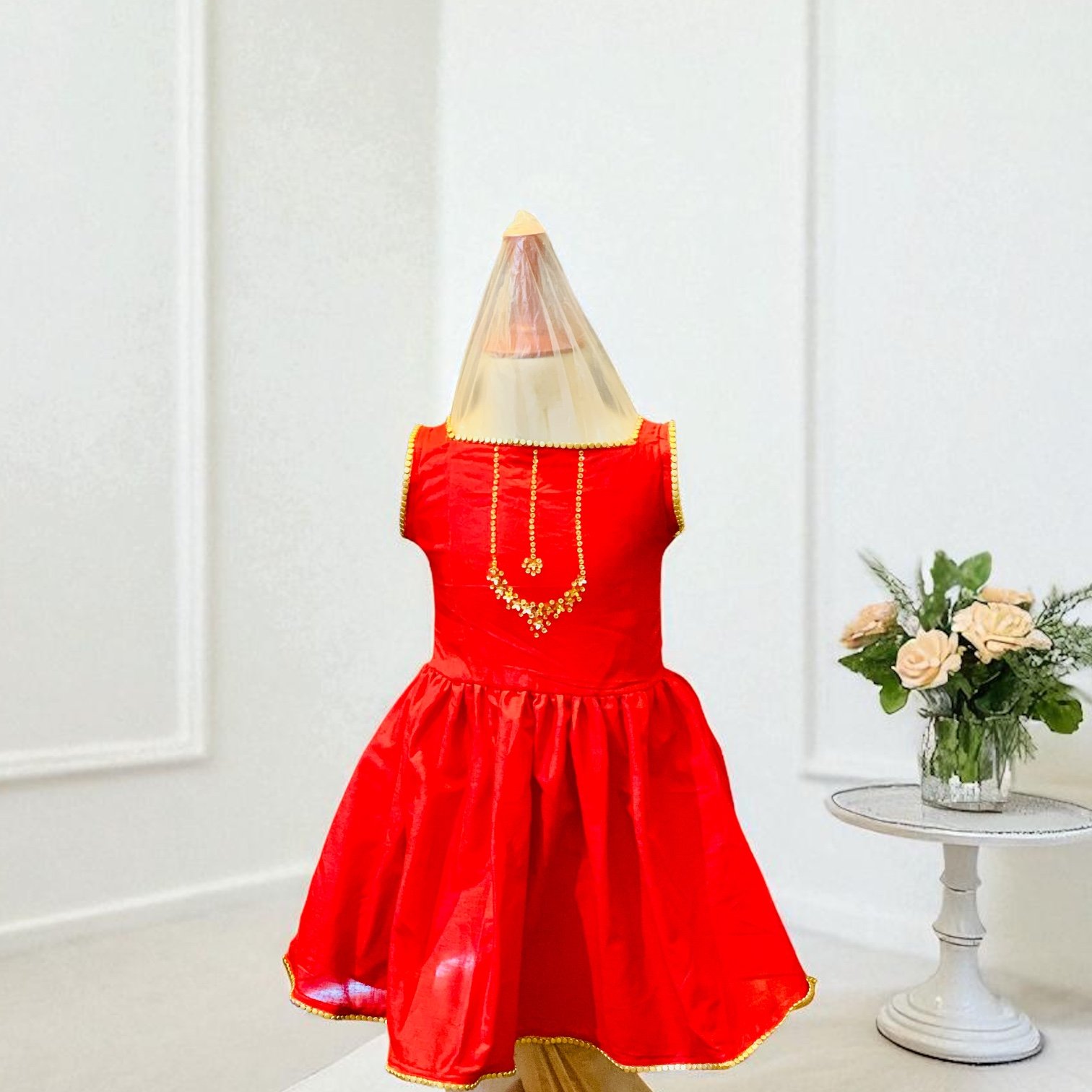 The outfit features a sleeveless short frock with a soft gathered flare. The rich red color gives it a bright festive look. Golden gota lace neatly outlines the sleeves and hemline.